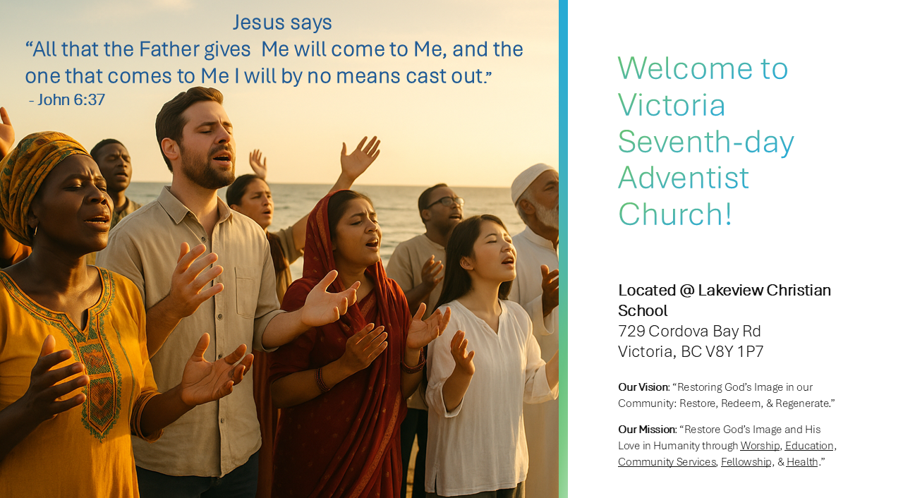 Welcome to the Victoria Seventh-day Adventist Church in Victoria, BC. This year, we are embarking on a journey to restore for the kingdom of God, everything that has been lost and broken in us, our community, and the world. Help us as restore God's Image and His Love in humanity through Worship, Education, Health, and Fellowship.