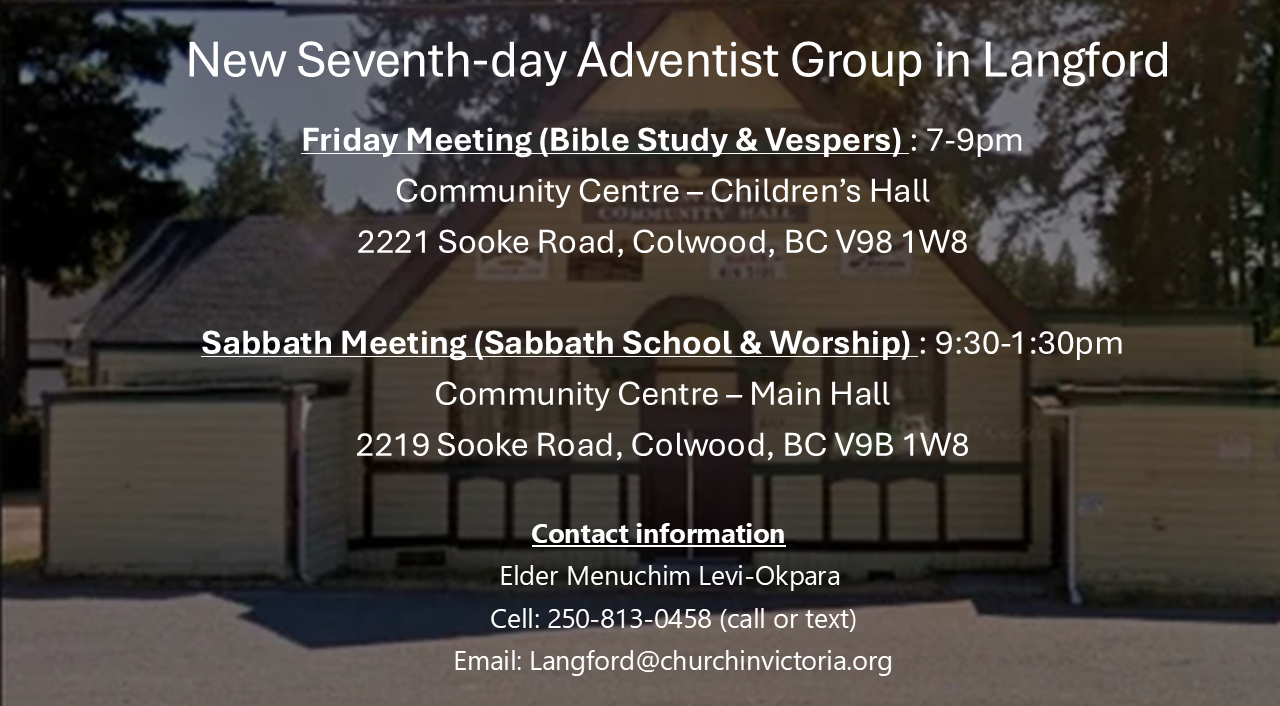 Sabbath School and Church Service are being held at Lakeview Christian School. Church Service can also be viewed on YouTube. Search for church in victoria.org
